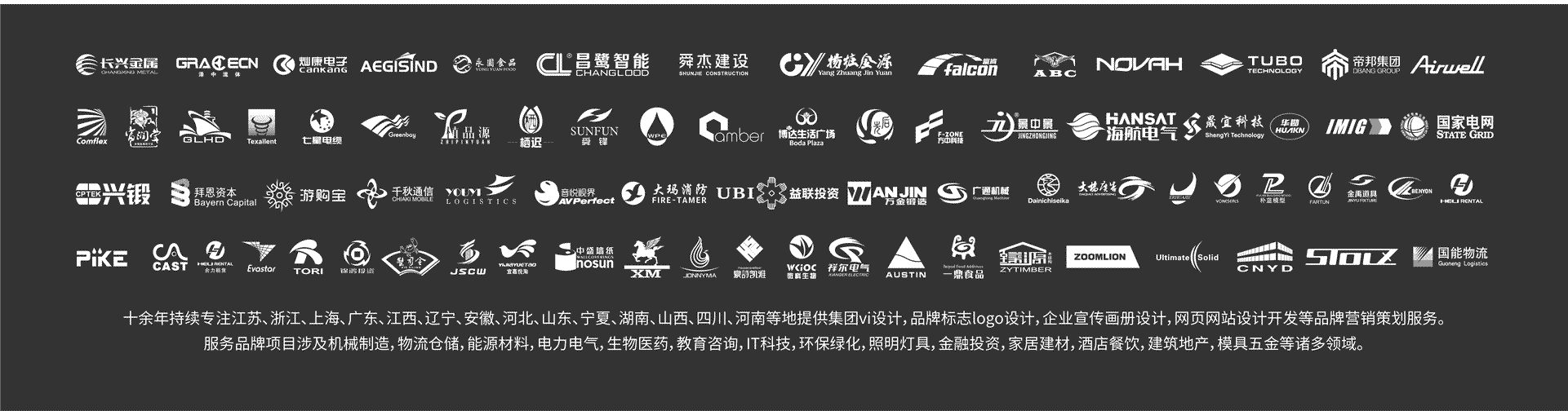 浙江轄下溫州、杭州、寧波、嘉興、湖州、紹興、金華、衢州、舟山、臺州、麗水等地區優秀企事業提供集團logo設計,商標標志設計,企業畫冊形象,宣傳畫冊設計印刷,包裝設計,品牌營銷策劃,展覽展示,宣傳片,企業網站開發服務。策劃設計服務客戶行業涉及
